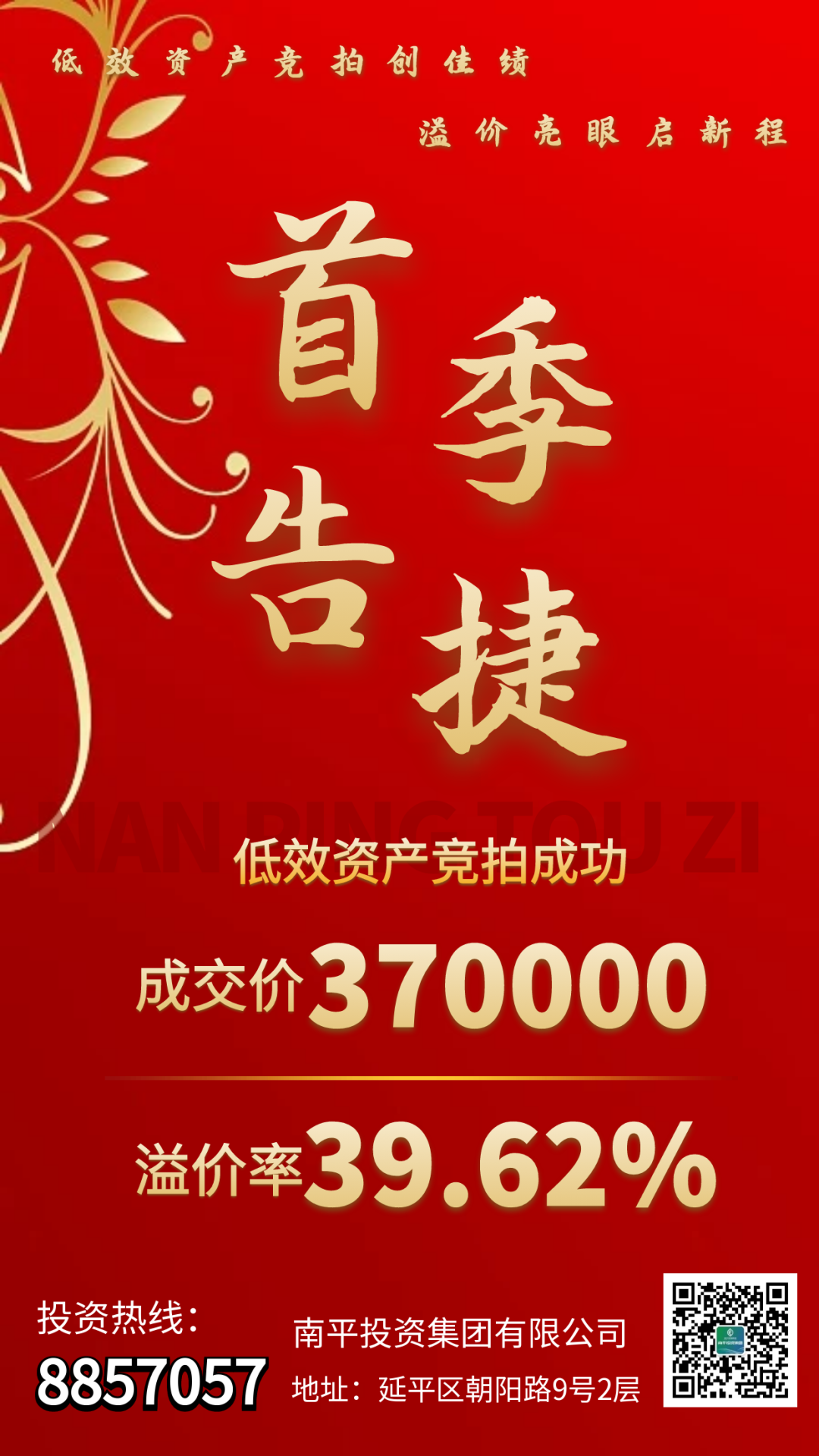 3月25日,投資集團通過南平市產權交易有限公司公開掛網招租的福建省南平市蔬菜食雜公司后谷倉庫,采用網絡競價模式,吸引了4名投資者的激烈角逐。經過多輪競價,最終以37萬落槌,溢價率達39.62%,遠超預期。